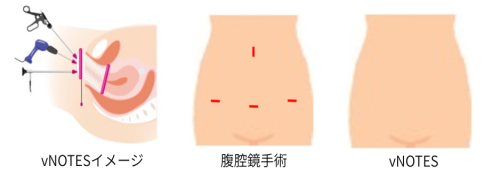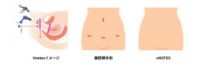 お腹に全く傷をつけない新しい腹腔鏡であるvNOTESも導入しております。vNOTESとはNatural Orifice Transluminal Endoscopic Surgeryの略で婦人科では膣からの内視鏡による手術を指し、お腹を切らずに膣から腹腔鏡の器具を利用し手術を行う(下図)ためお腹の痛みはほとんどなく、腹腔鏡手術の中でもさらに回復が早いといわれています。