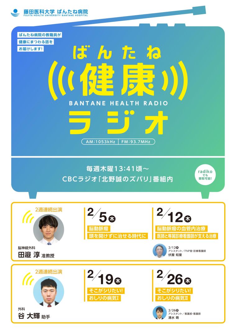 脳神経外科 田邉 淳 准教授 2週連続出演■2月5日(木)「脳動脈瘤 頭を開けずに治せる時代に」
