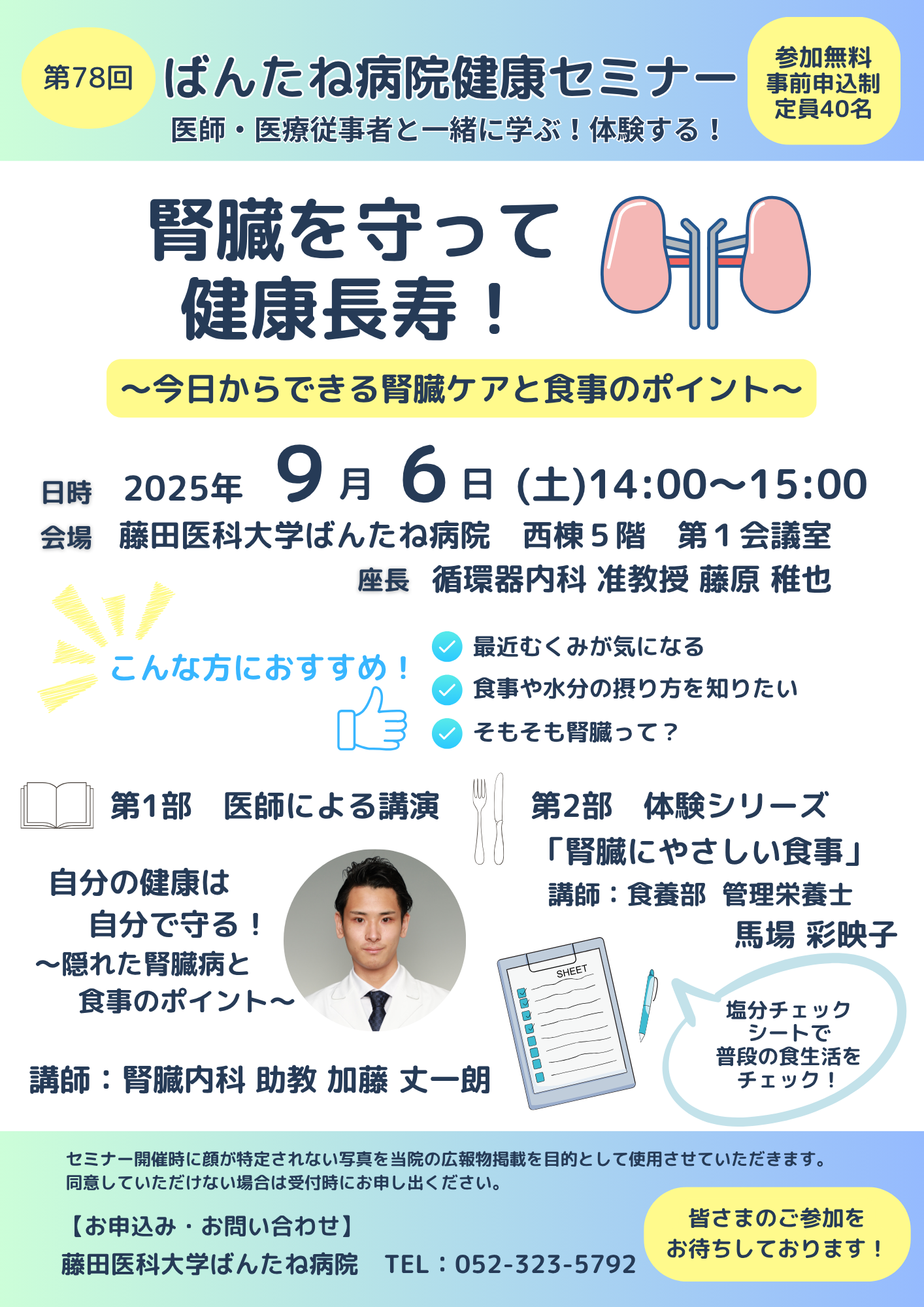 第78回 | 2025.9.6 | 「自分の健康は自分で守る!~隠れた腎臓病と食事のポイント」 講師:腎臓内科 助教 加藤 丈一朗 *体験シリーズ「腎臓にやさしい食事」 講師:食養部 管理栄養士 馬場 彩映子 |